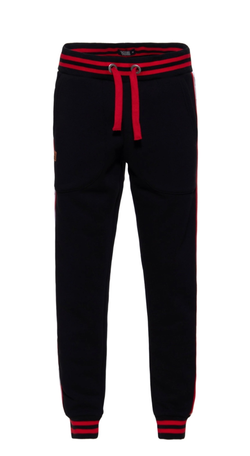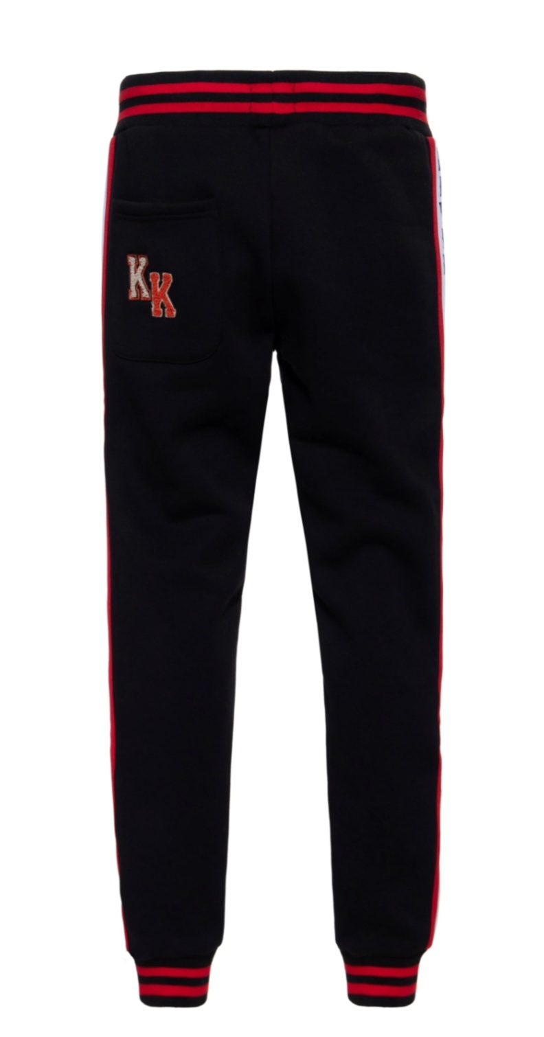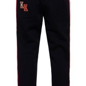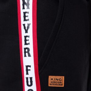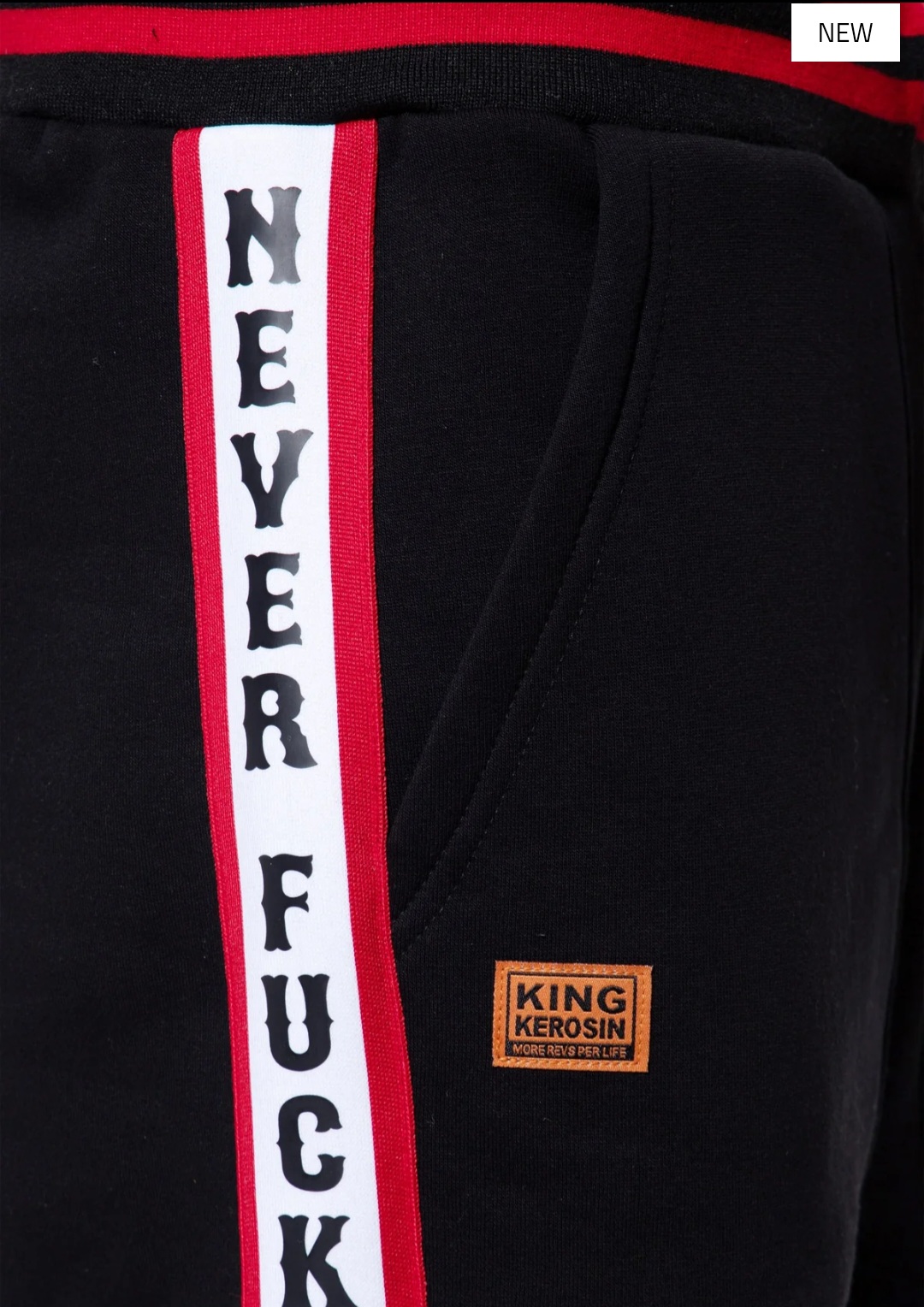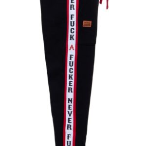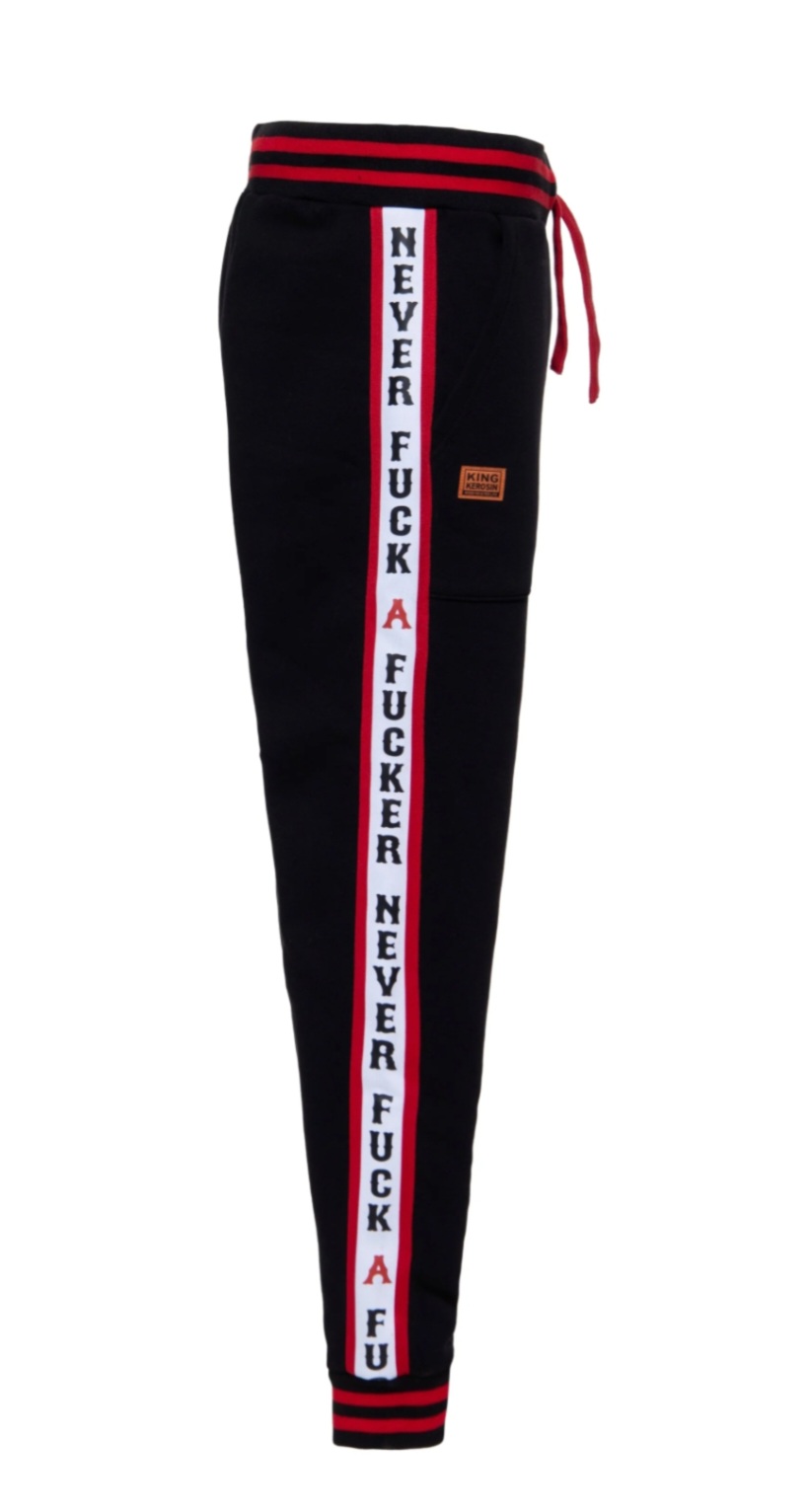 Diese King Kerosin Jogginghose setzt auf klare Kontraste und einen selbstbewussten Auftritt. Der breite, gestreifte Rippbund mit Kordelzug sorgt für sicheren Sitz, während das weiche Sweatmaterial mit angerauter Innenseite angenehm warm hält. Seitlich zieht sich der markante Schriftzug „Never Fuck A Fucker“ entlang des Beins und verleiht der Hose ihren unverwechselbaren Charakter.